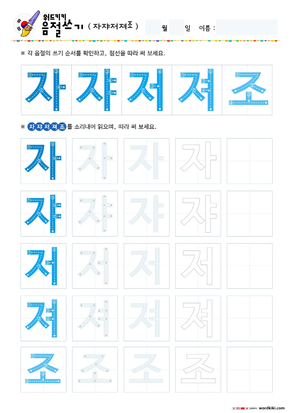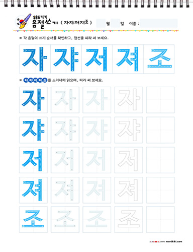 음절쓰기 – 자쟈저져조죠주쥬 쓰기 연습