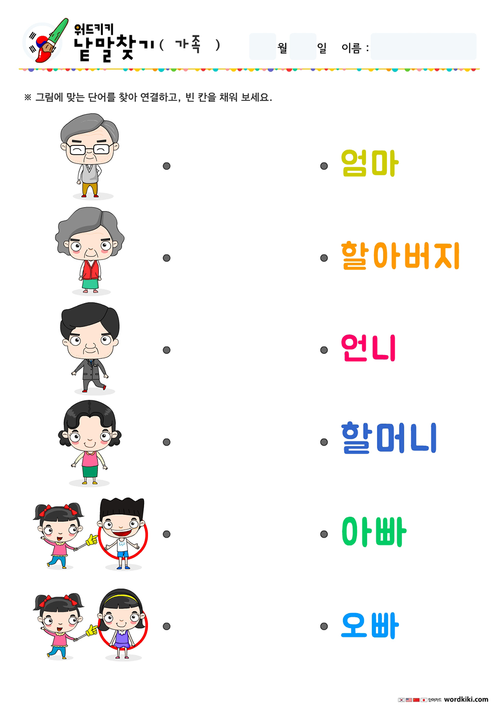 할아버지,할머니,아빠,엄마,오빠/형,언니/누나,남동생,여동생,아들,딸
