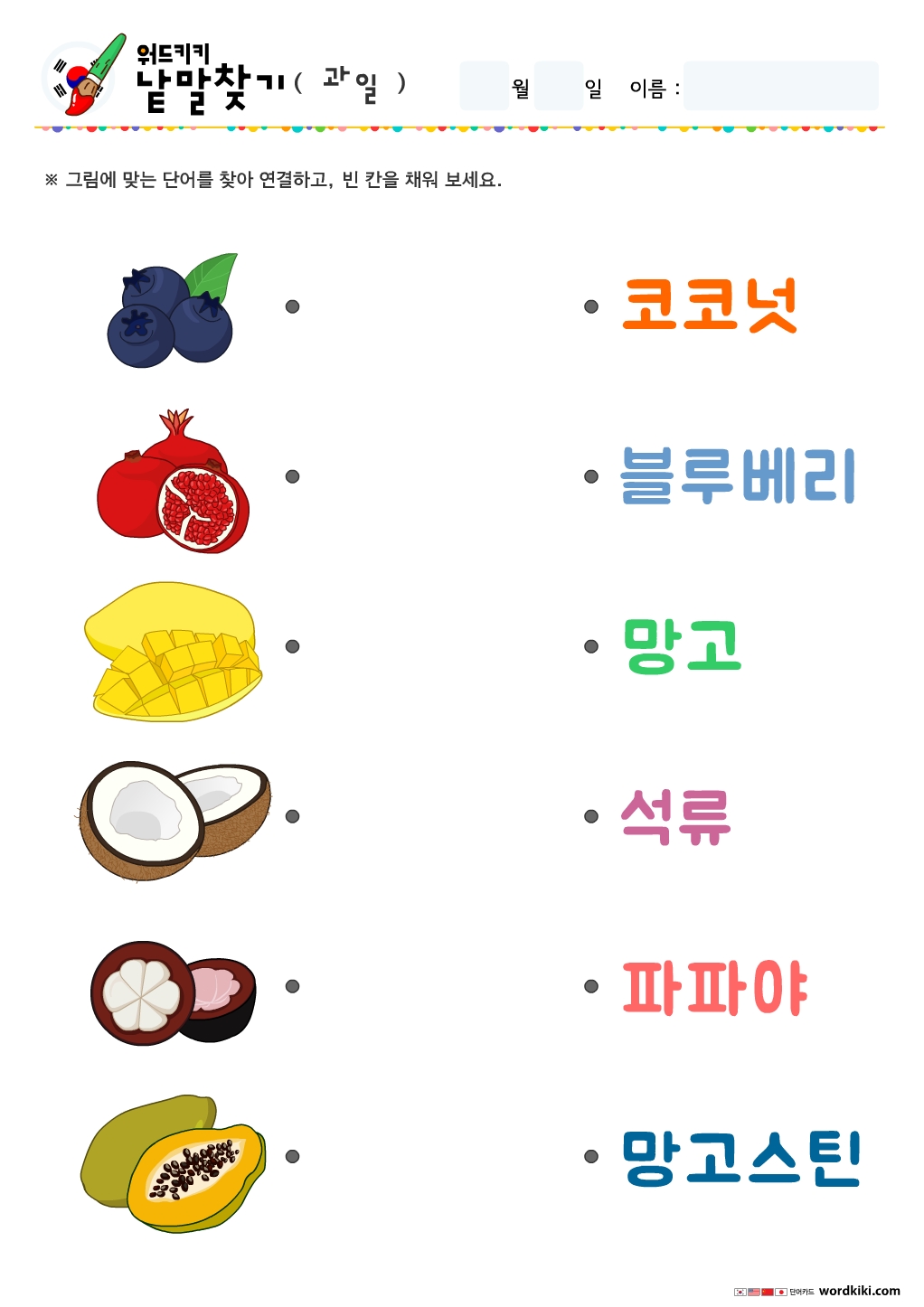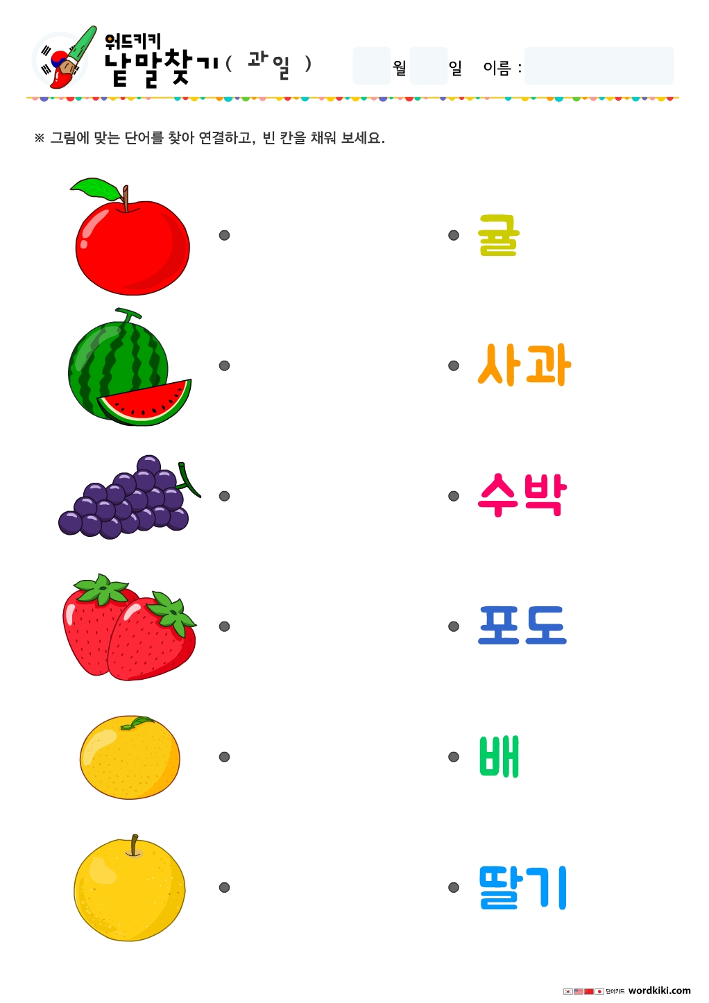 사과,수박,포도,딸기,귤,배,바나나,복숭아,레몬,감,파인애플,오렌지,멜론,자두,키위,참외,체리,라임,블루베리,석류,망고,코코넛,망고스틴,파파야 등 과일단어 익히기