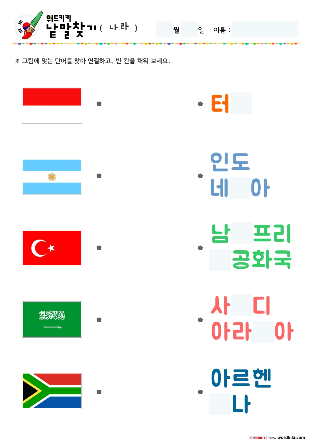 [유아한글공부 8장] 07 나라(국기) - 한글낱말 그림연결하기