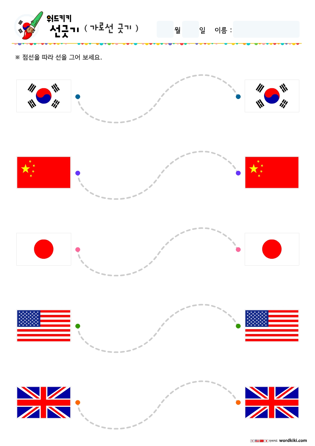 곡선을 따라 그리는 프린트 학습지로 로케트, 개구리, 안경, 나라 등다양한 테마로 작성되었으며