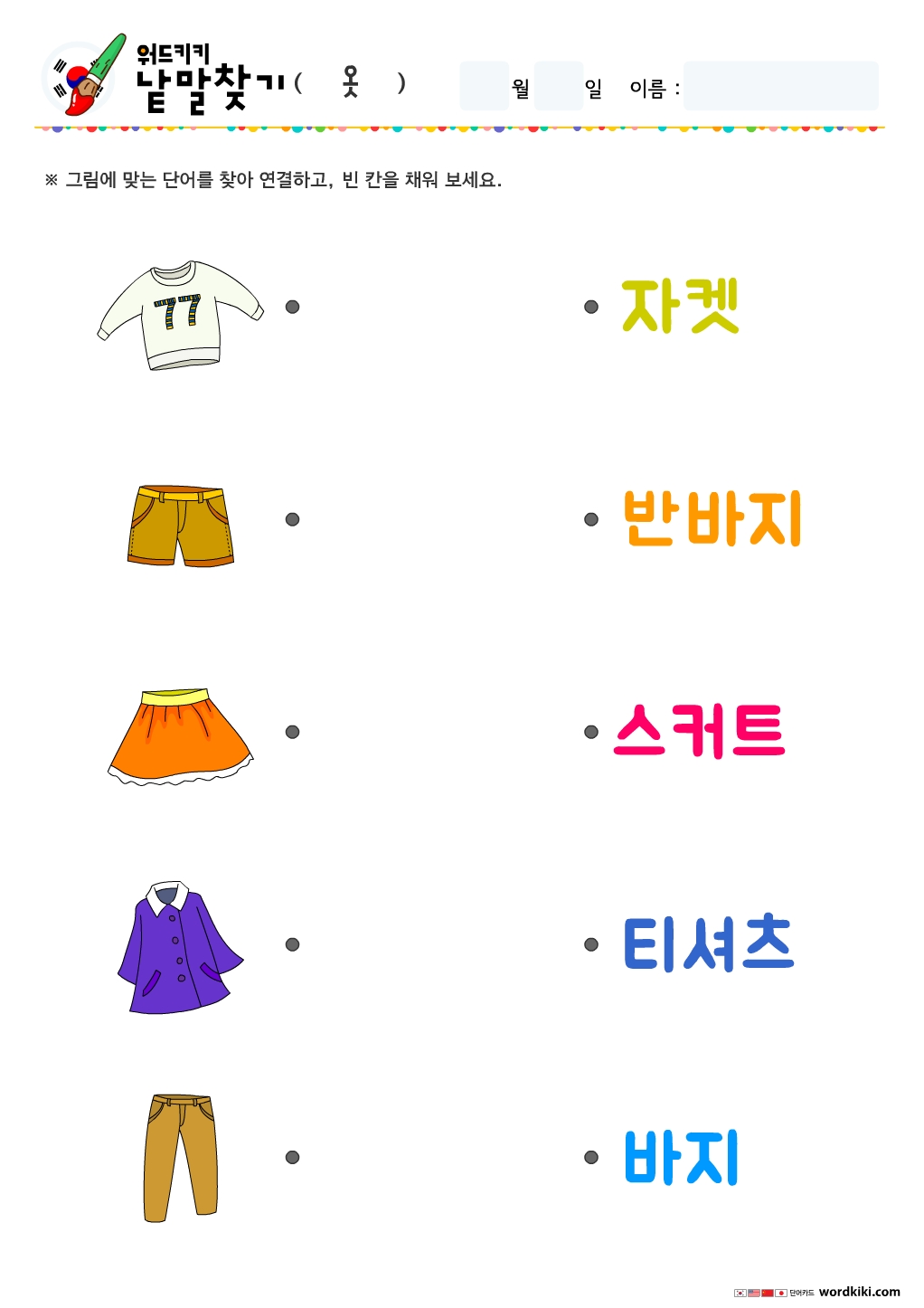 옷 그림을 보고 맞는 단어를 찾아 선으로 연결해 주세요!!
