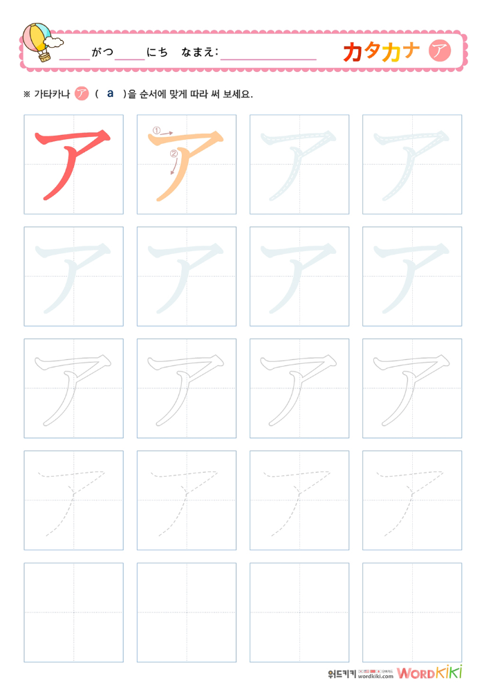 가타카나 カタカナ 따라쓰기 무료프린트학습지로 가타카나 쓰기 연습장입니다.