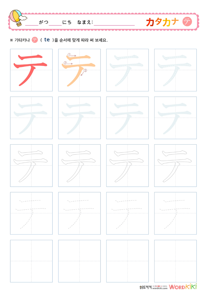 가타카나 カタカナ 따라쓰기 무료프린트학습지로 가타카나 쓰기 연습장입니다.