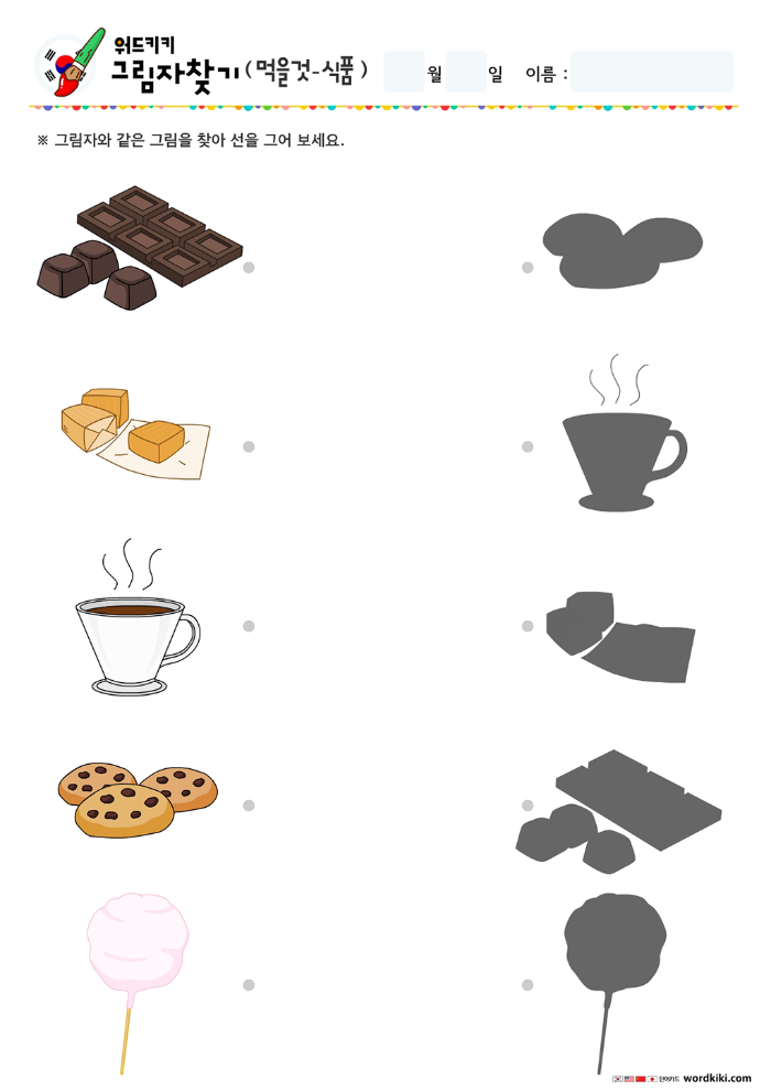 빵 그림자찾기,우유 그림자찾기, 과일 그림자찾기,아이스크림 선긋기,주스 선긋기, 계란 선긋기, 과자 선긋기, 채소 선긋기, 케이크 선긋기, 사탕 선긋기, 초콜릿 선긋기, 캐러멜 선긋기, 커피 선긋기, 쿠키 선긋기, 솜사탕 선긋기, 아이스크림 콘 선긋기, 막대사탕 선긋기, 팝콘 선긋기, 차 선긋기, 도넛 선긋기