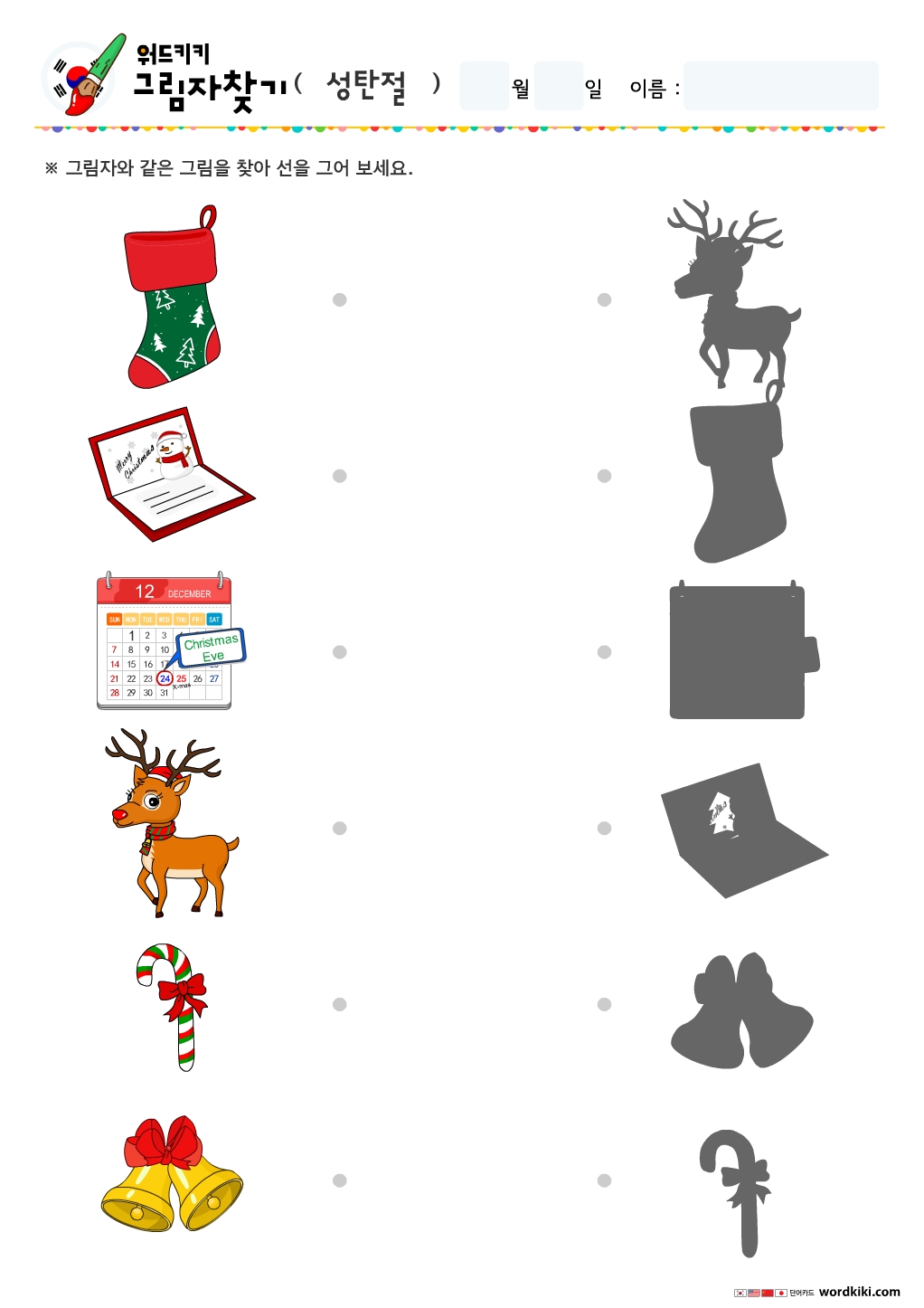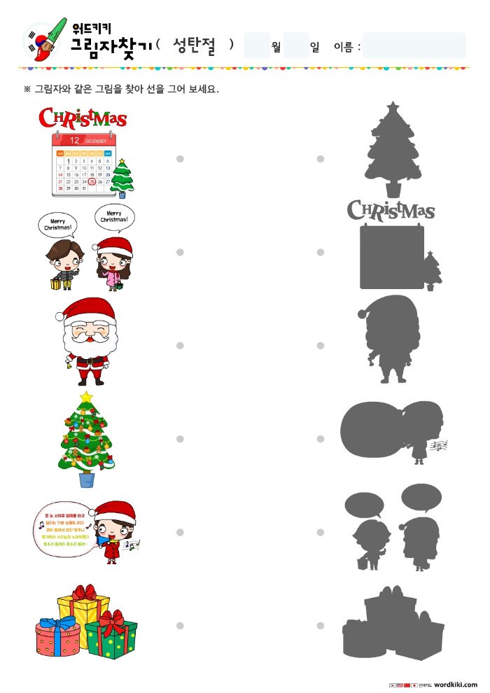 성탄절,크리스마스 선긋기, 메리 크리스마스,산타클로스,크리스마스트리 선긋기, 캐럴,선물 선긋기, 크리스마스양말 선긋기, 크리스마스 카드,크리스마스 이브,루돌프선긋기, 사탕,종,양초 선긋기, 리스,생강빵,썰매 선긋기, 눈사람 선긋기, 장식 그림자찾기