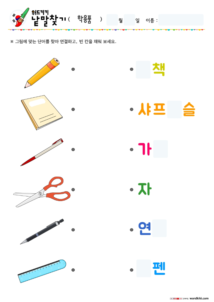 [한글 활동지 6장] 25 학용품 단어연결하기