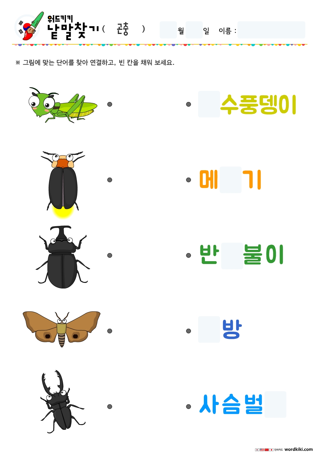 개미 곤충 낱말찾기, 벌 낱말찾기, 파리 낱말찾기, 나비 낱말찾기, 잠자리 낱말찾기, 무당벌레 낱말찾기, 거미 낱말찾기, 지렁이 낱말찾기, 매미 단어찾기, 모기 낱말찾기, 사마귀 낱말찾기, 메뚜기 낱말찾기, 반딧불이 낱말찾기, 장수풍뎅이 낱말찾기, 나방 낱말찾기, 사슴벌레 낱말찾기.