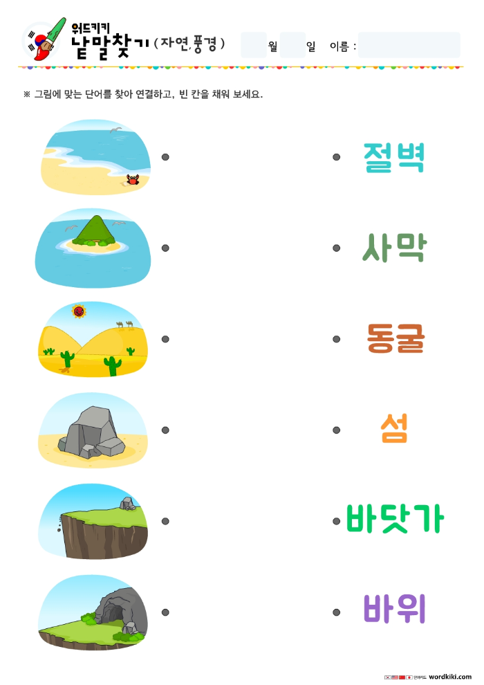 자연풍경 단어에 알맞는 그림을 찾아, 선긋기와 단어쓰기를 한번에!
