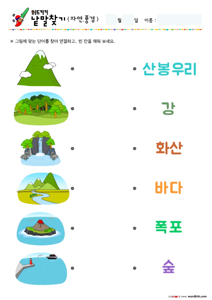 [한글 활동지 6장] 36 자연,풍경 단어연결하기