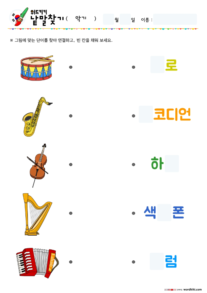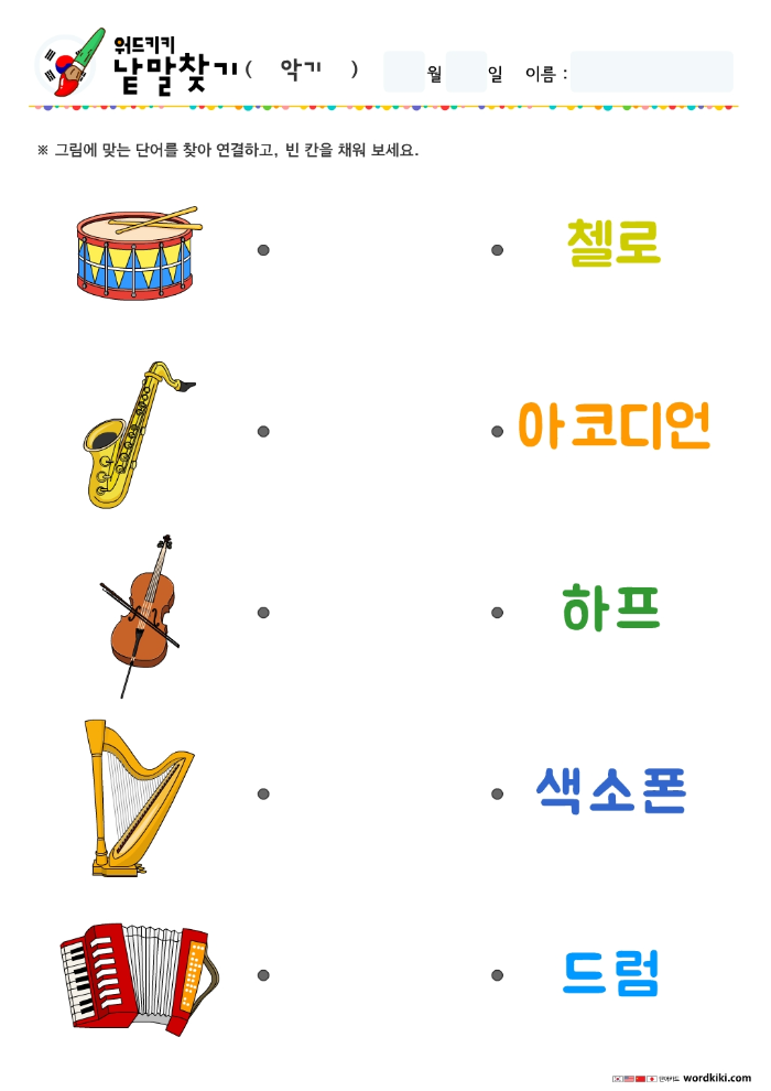악기 단어에 알맞는 그림을 찾아, 선긋기와 단어쓰기를 한번에!