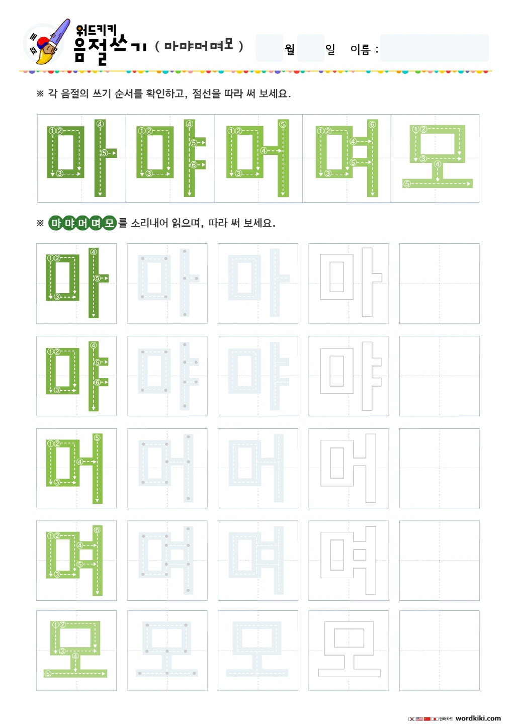 음절쓰기 – 마먀머며모묘무뮤 쓰기 연습