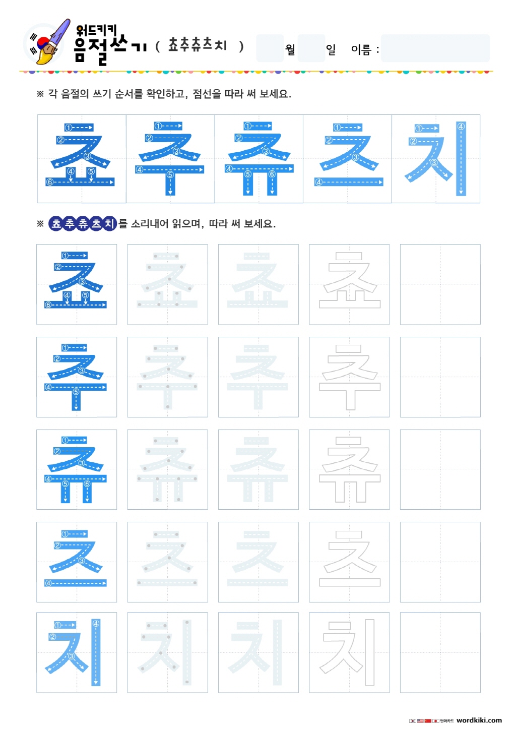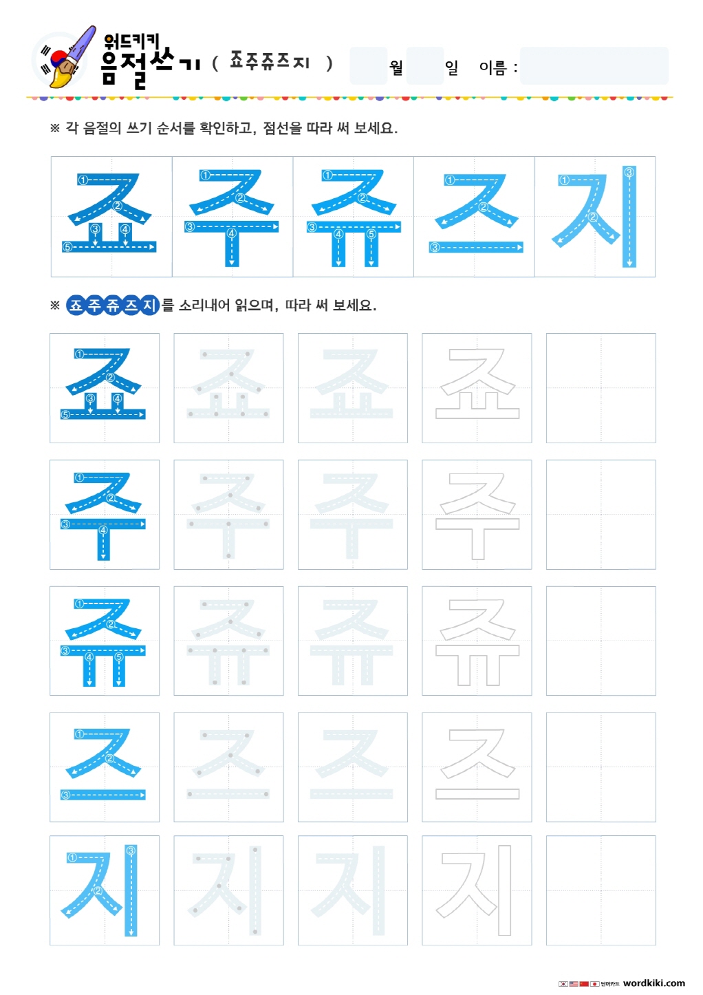 음절쓰기 – 자쟈저져조죠주쥬 쓰기 연습