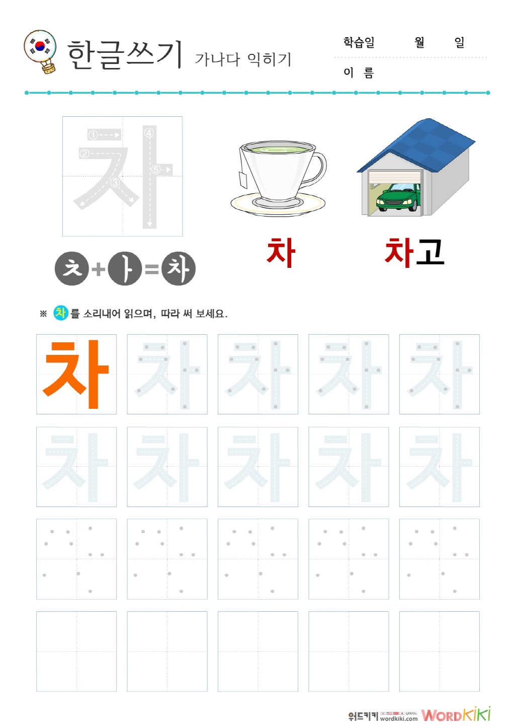 [한글기초쓰기 7장] 가나다라쓰기+이미지① - 아/자/차/카/타/파/하