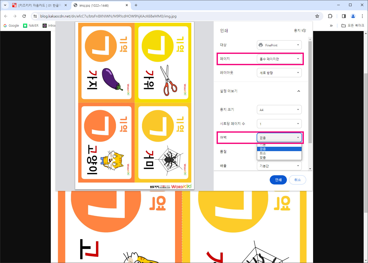 ※ 여백 없음 선택 시 페이지가 2페이지로 늘어나 빈 종이가 출력될 수 있습니다.